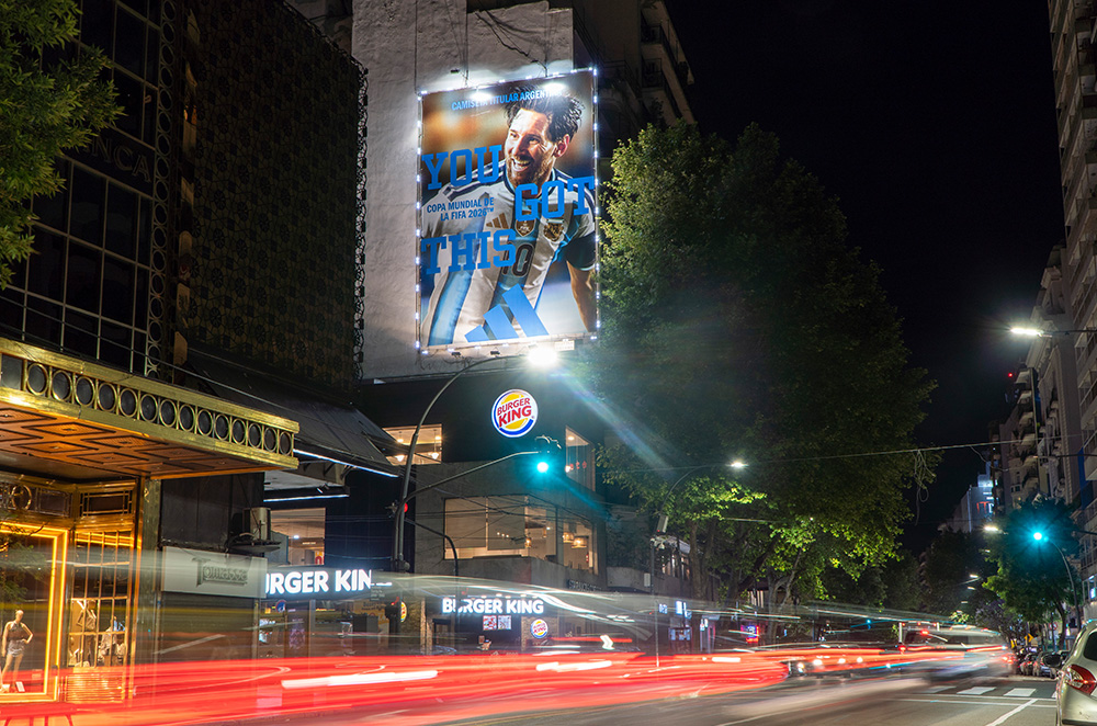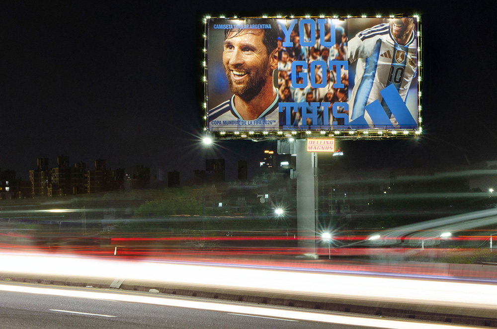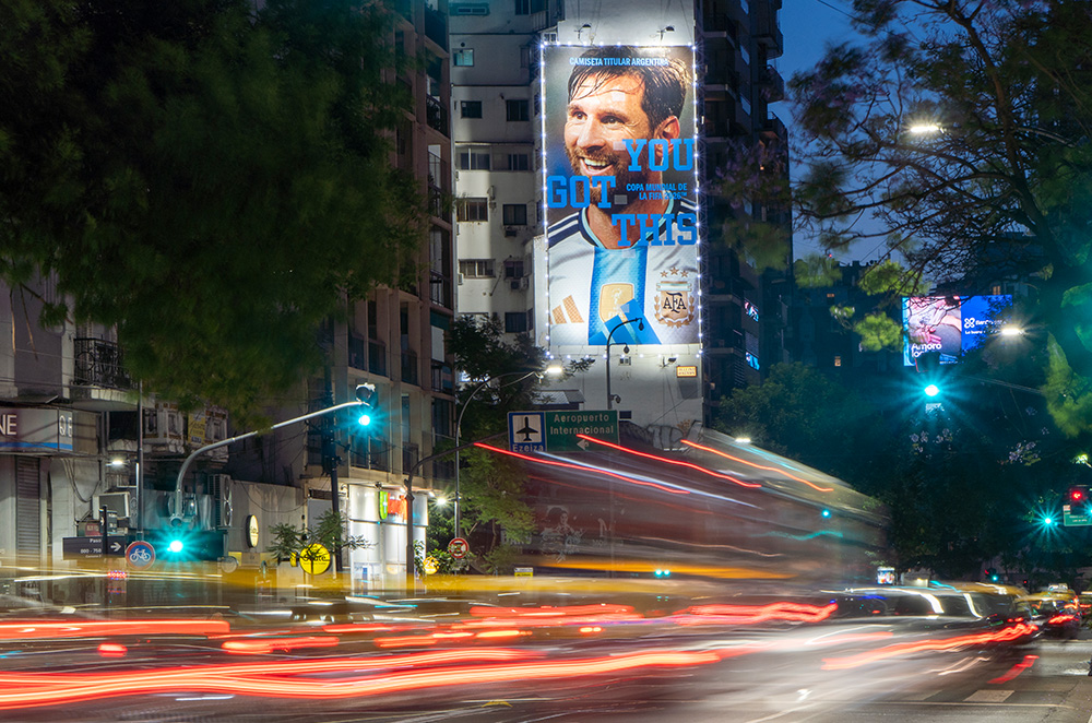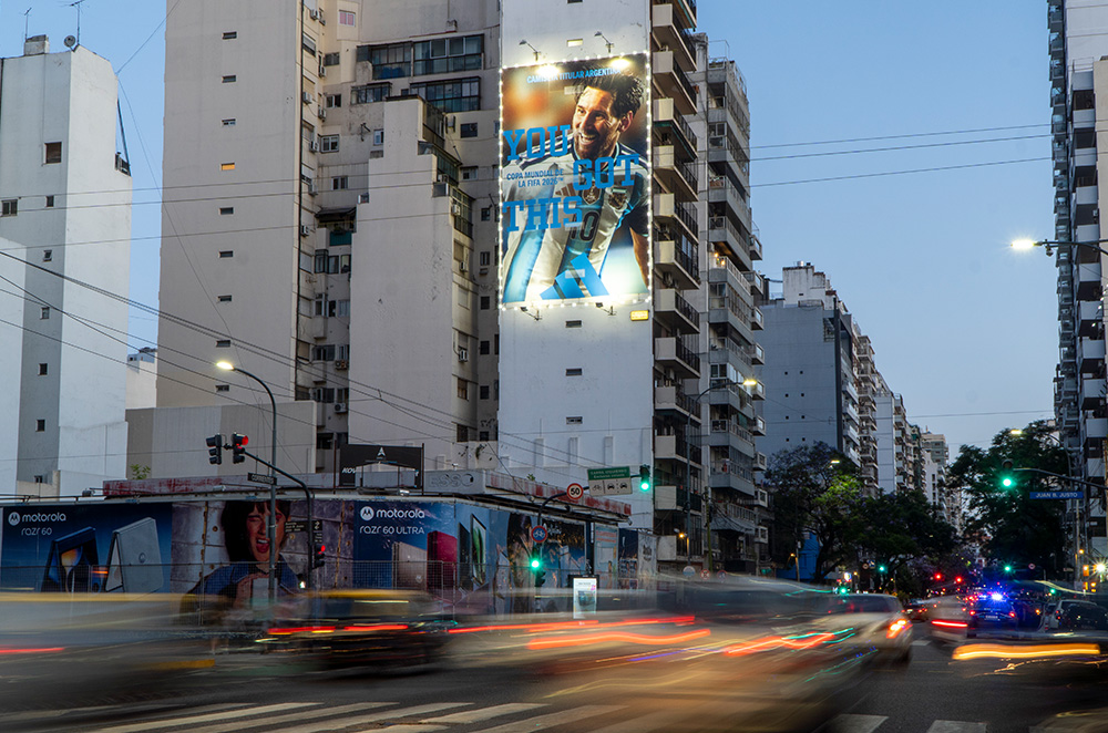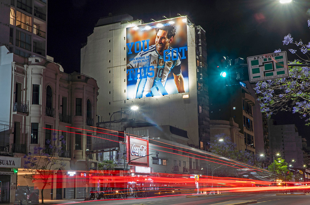 Adidas despliega su campaña OOH en nuestro circuito de Mediawalls y Monocolumnas, generando un alto impacto en puntos estratégicos de la ciudad. Una presencia urbana de gran formato que capta miradas y amplifica el espíritu de la nueva piel albiceleste.
