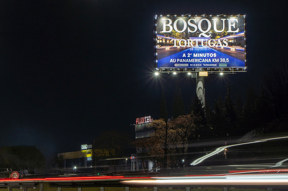 Columna Espectacular con Sistema Perimetral de luz LED blanco simple faz de grandes dimensiones iluminada mediante tecnología LED, limitando el impacto sobre nuestra huella de carbono, y optimizando el consumo energético; sita en Panamericana Km. 34,200 – Pablo Nogués Malvinas Arg., Pcia. de Bs. As.